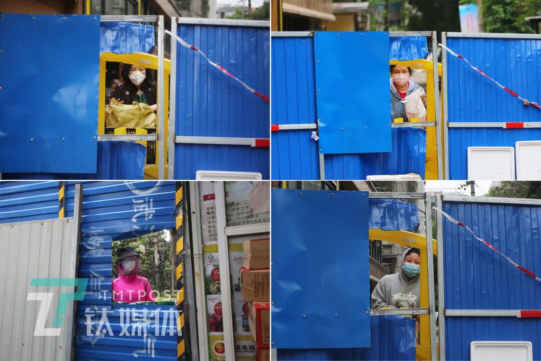4月11日,黄波透过围挡上的方形缺口跟居民交流。这里本来是小区的侧门,疫情期间被封。