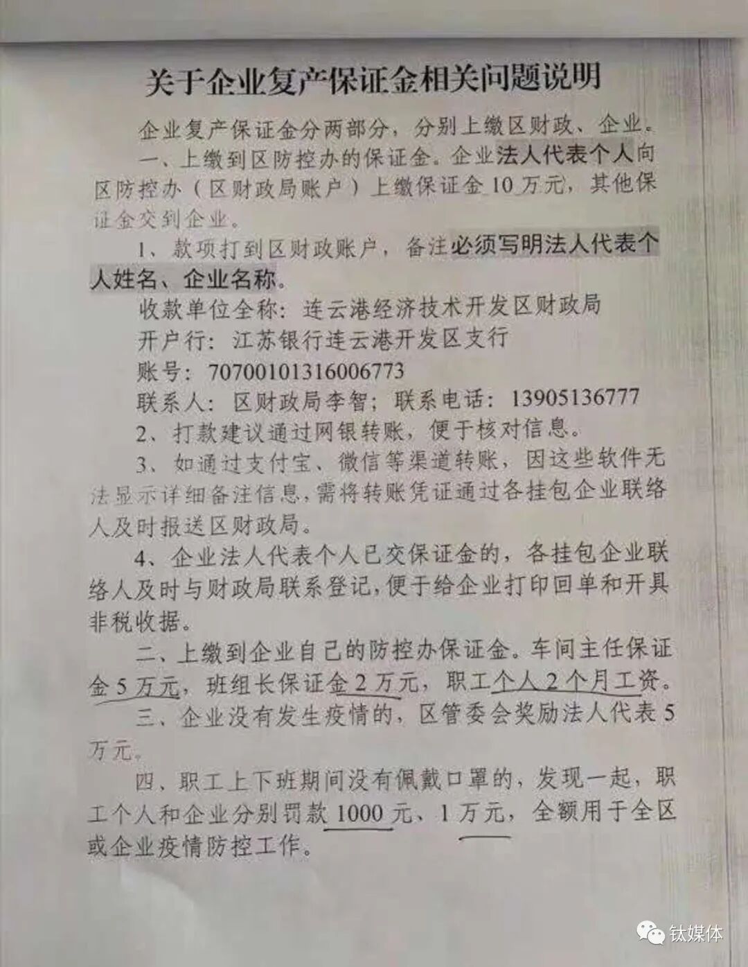 连云港经开区要求企业复工需缴纳10万元保证金,若无疫情发生全额返还