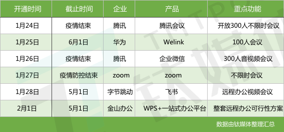 疫情期间,各大在线办公平台推出的免费措施(整理/钛媒体内容中心)