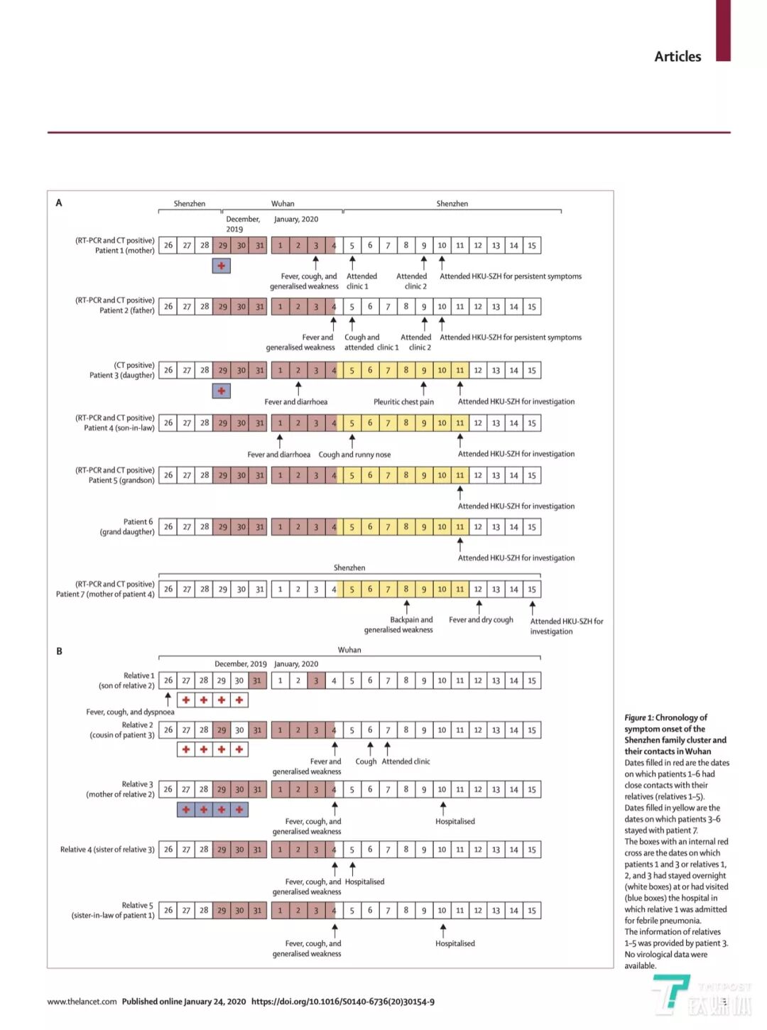 深圳 7 口之家新冠肺炎症状发作及其在武汉的时间点,填充的日期是患者“人与人”之间传播的日期,最后确认有 6 人感染新冠病毒(来源:柳叶刀论文)