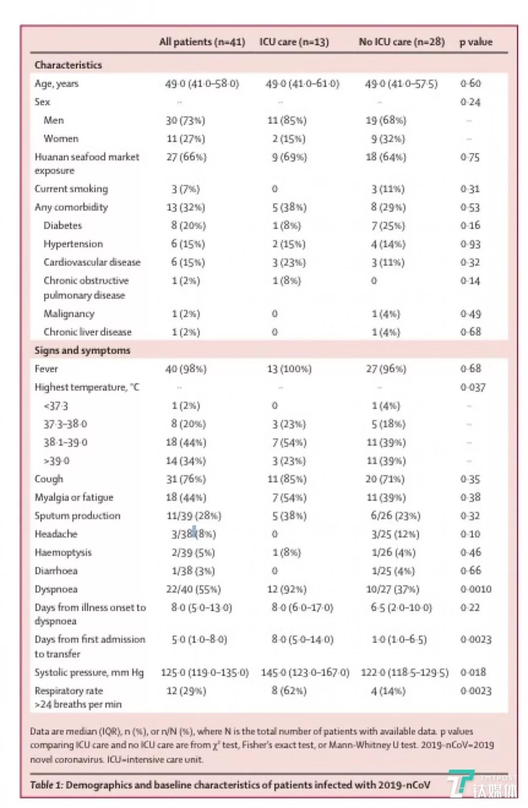 早期病例患者的临床特征数据(来源:柳叶刀论文)