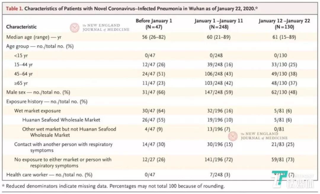 另外,通过NEJM这篇论文,我们知道了一个事实,在2020年1月11日之前确诊的295人里,只有45人去过华南海鲜市场,大部分人都是通过“人传人”方式进行传播,此外还有 7 名医护人员感染,这成为最早报告医护人员感染的临床数据报告。