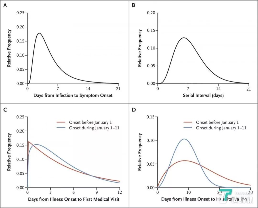 论文当中显示的另一条曲线(图A),横坐标是从感染到症状发作的天数。数据显示,新冠病毒感染者7天内就会发病,病毒的平均潜伏期是 5.2 天。而根据最新诊疗方案当中显示,基于目前的流行病学调查,新冠肺炎潜伏期为 1-14 天,多为 3-7 天。