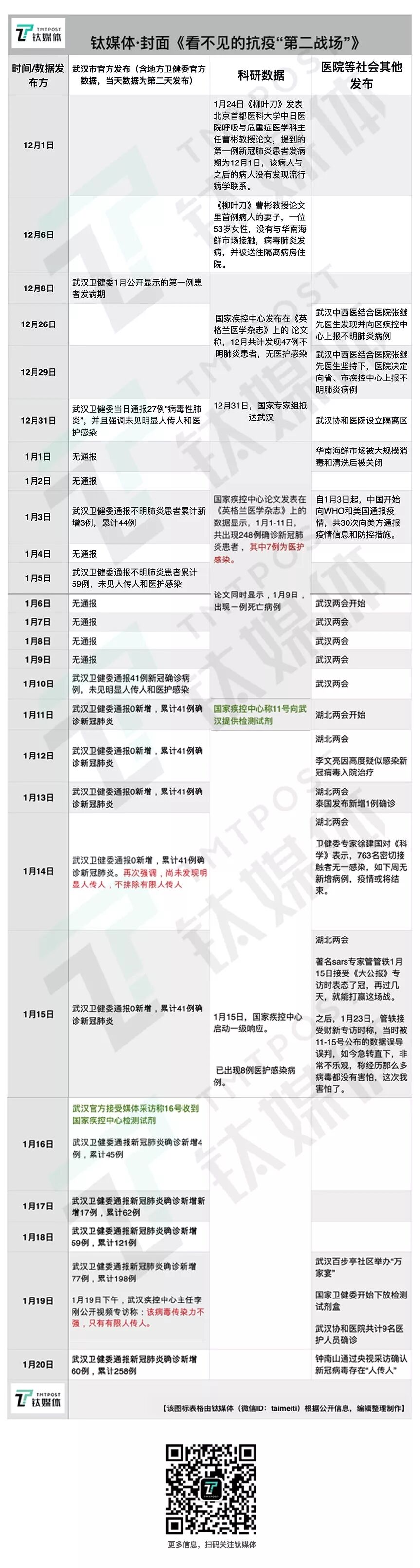 钛媒体(微信ID:taimeiti)整理了武汉当地政府公布的官方数据以及中国两级疾控中心和相关医疗单位最近一个月刊登在《柳叶刀》、《新英格兰医学杂志》、《自然》等平台上发表的论文数据信息。可以明显看出,1月22日之前,武汉当地政府在多个时间点的发布的确存在瞒报、谎报等情况,与前述国家疾控中心在《新英格兰医学杂志》论文当中发布的数据信息不符,前文也已经阐述,国家疾控的这篇论文虽然是回述性的,但是相关数据却是病发当时即已及时掌握的,所以双方的信披情况有较强的参考性。