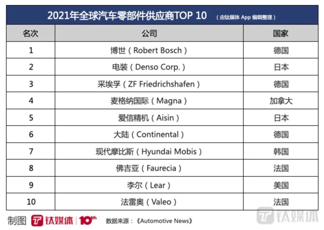 世界知名汽车零部件供应商也多将中国区总部及工厂设于上海。在《Automotive News》评选出的2021年全球十大汽车零部件供应商中,博世、采埃孚、麦格纳国际、爱信、大陆、现代摩比斯、佛吉亚、李尔与法雷奥均在上海设立了工厂。
