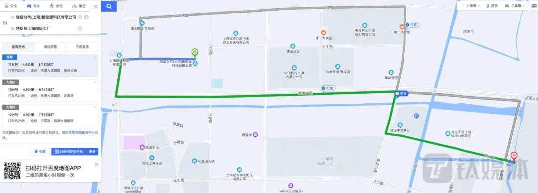 地图显示宁德时代上海工厂与特斯拉超级工厂距离不到5公里。