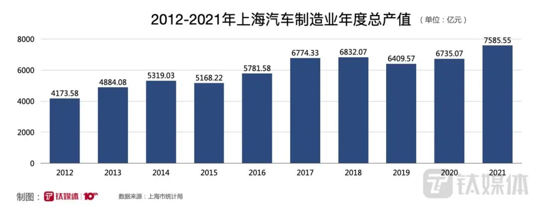 上海市统计局2021年的年报数据显示,上海当年汽车业全年共生产汽车283万辆,产值7586亿元,营业收入8685亿元,利润总额达到了598.73亿元,上海市规模以上企业总产值的19.2%来自汽车行业。