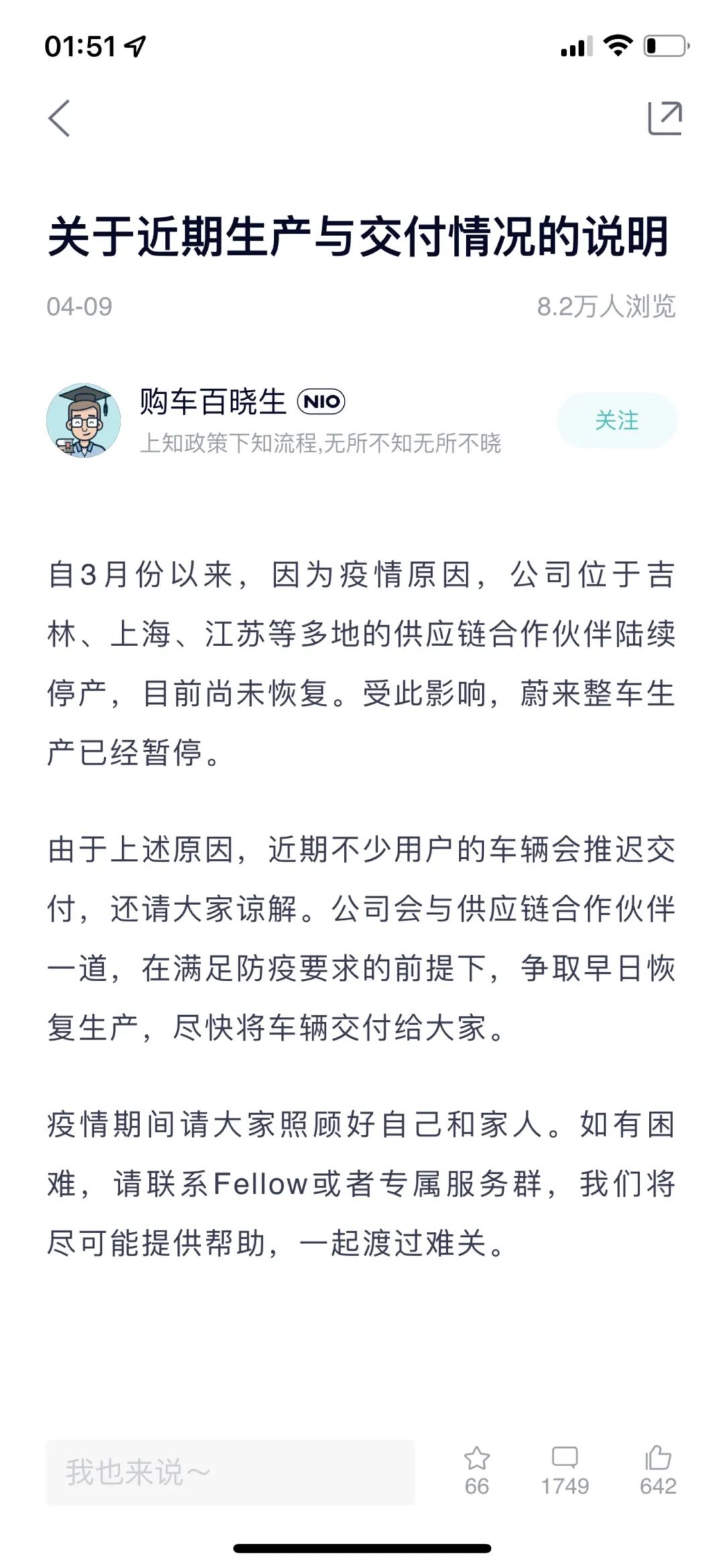今年三月,蔚来汽车便因此一语成谶,被迫宣布由于供应链伙伴停产不得不暂停整车生产。蔚来汽车创始人、CEO李斌表示,一辆车差一个零件都没办法生产,上海与江苏的疫情使得很多合作伙伴无法供货,只能暂停生产。李斌还称因此停产的并非只有蔚来一家,很多车企都被迫停产。