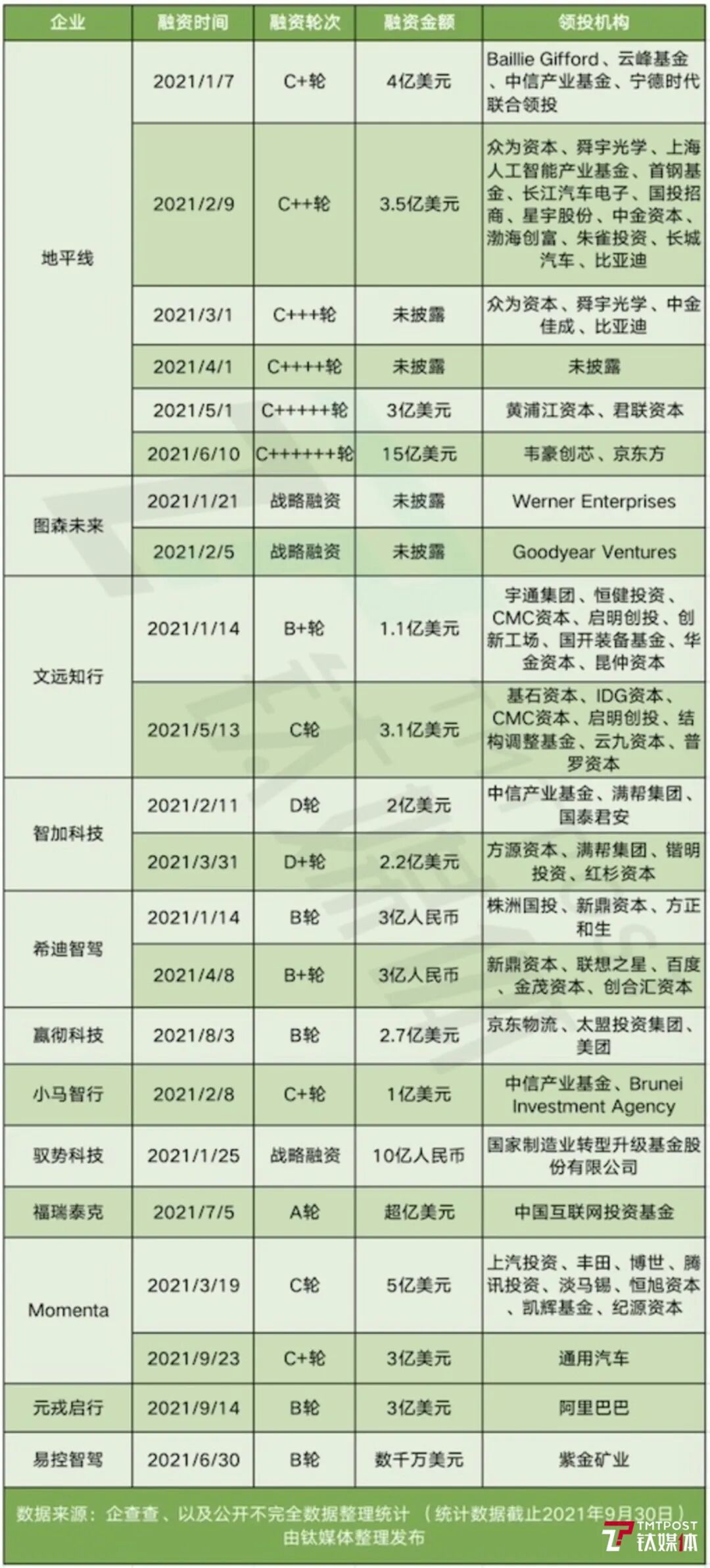 而在此之前,自动驾驶赛道可谓疯狂,在全球范围仍在频频刷新融资规模。据钛媒体 TMTBase 数据库,仅 2021 年上半年中国市场就发生了近 50 起自动驾驶相关融资,涵盖了包括整车、芯片、雷达,及自动驾驶及智能座舱解决方案等领域。