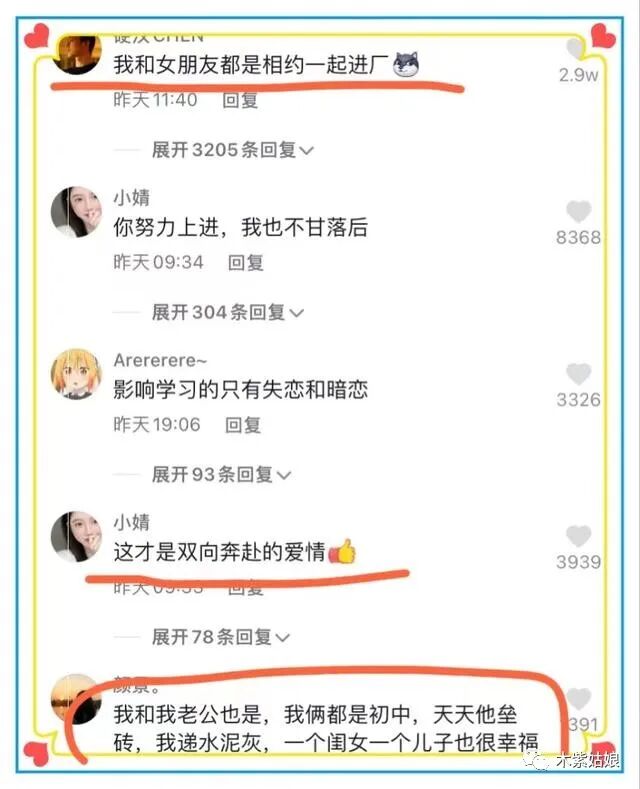 网友颜景的回评则更是精彩,她说,我和我老公也是,我俩都是初中生,天天他垒砖,我和水泥,如今儿女双全也很幸福的。
