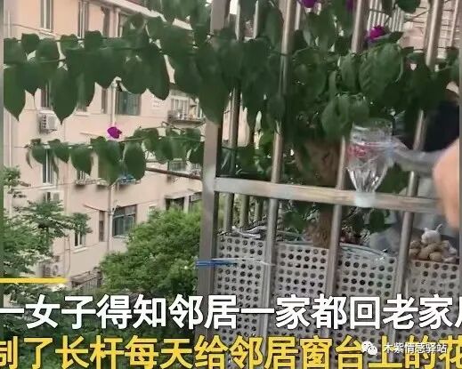 于是女子特地想办法自制了一个浇水工具,她用一根长杆,一端绑上半截塑料桶,然后接满水,小心翼翼地伸到邻居家的阳台上,每天为邻居家的花儿浇水。