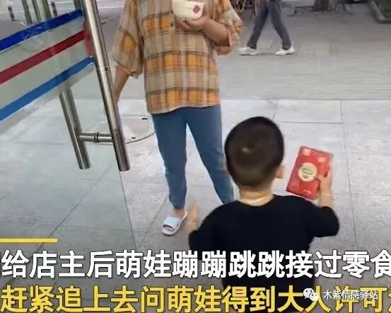 好心的店主,直接把零食递给小朋友,孩子开心地回去了。
