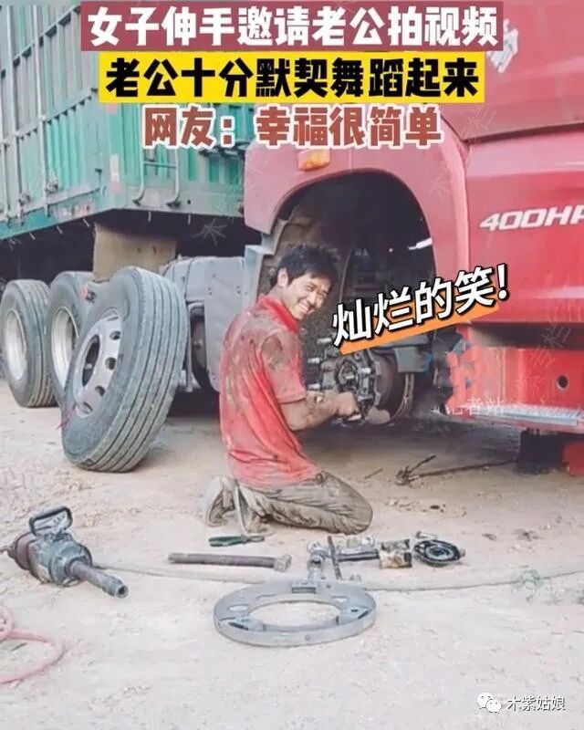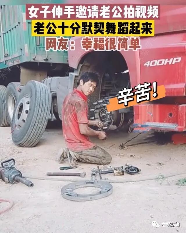 女子说,自己老公是一名修车工,平时就靠修理汽车营生,说着她把手机转向了老公工作的地方,画面中,男子双膝跪地,同样是脏兮兮的样子,他正在为一个大货车更换轮胎部件。