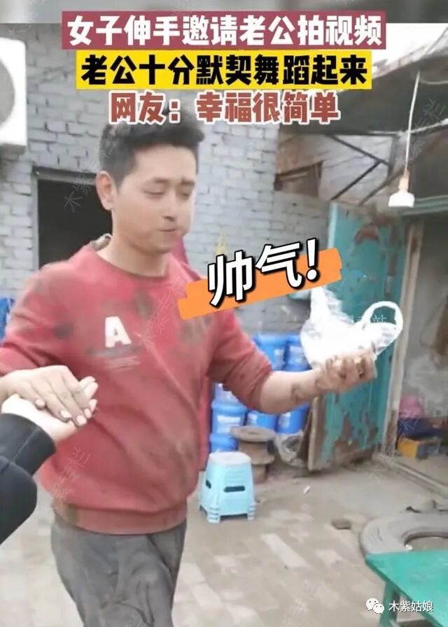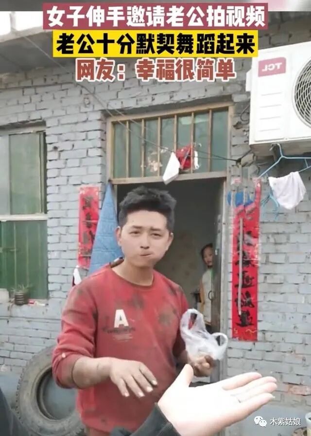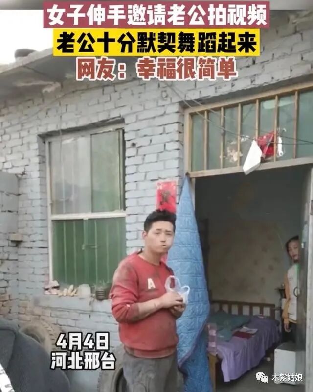 丈夫看到妻子示意的眼神,马上秒懂,他嘴里嚼着实物,毫不在意地走过来,用沾满灰尘和泥土的,那脏兮兮的手,握住妻子白净的手掌,随着音乐,扭动着身体,翩翩起舞。