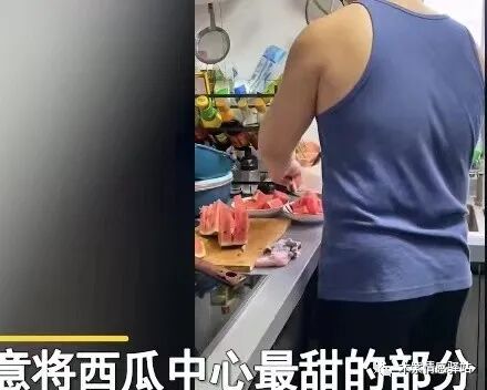 男子切西瓜,甜甜的西瓜心都留给妻子。