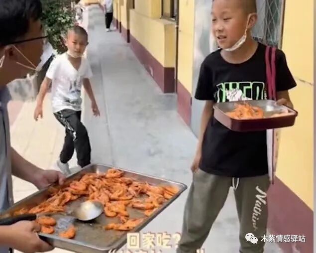 校长分发大虾,孩子全都留着,一个没有吃。