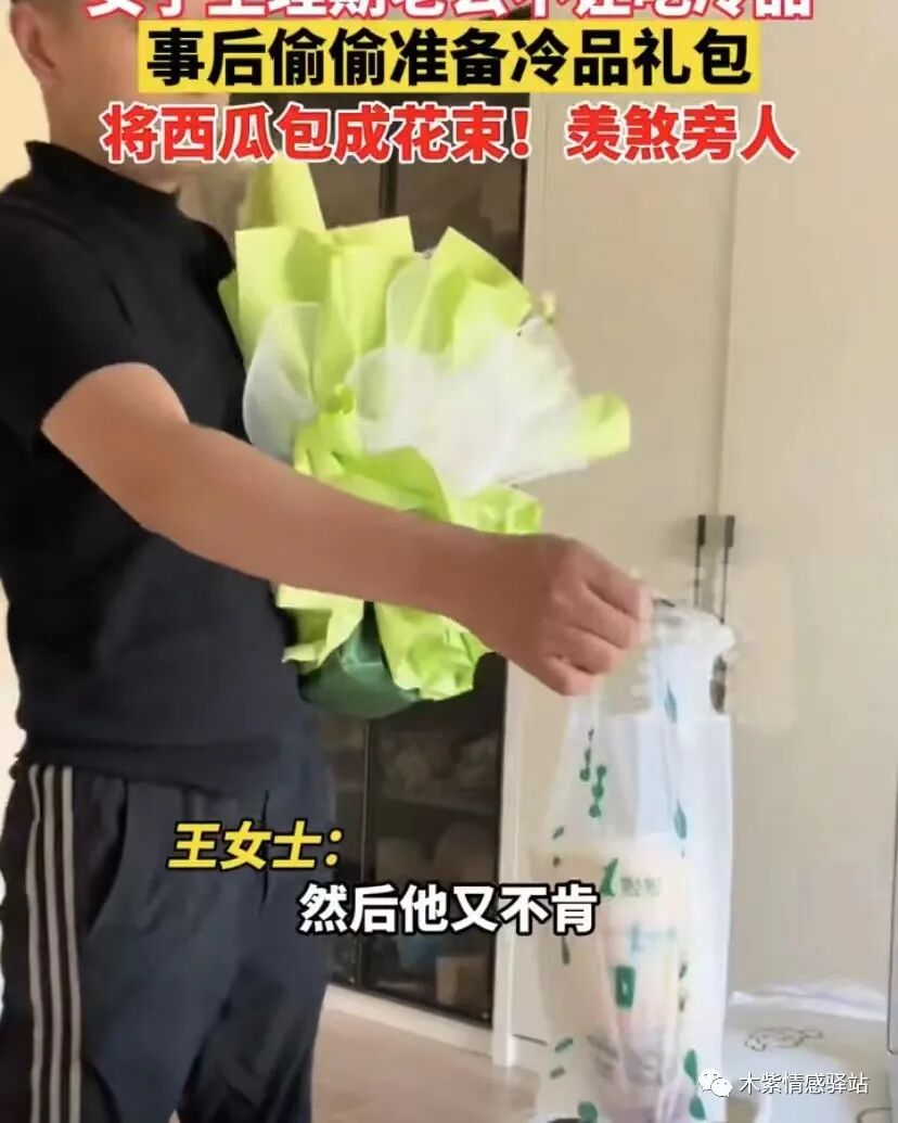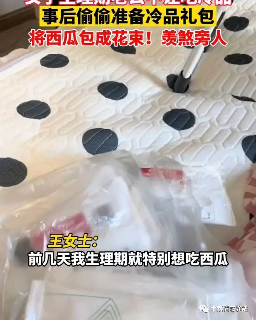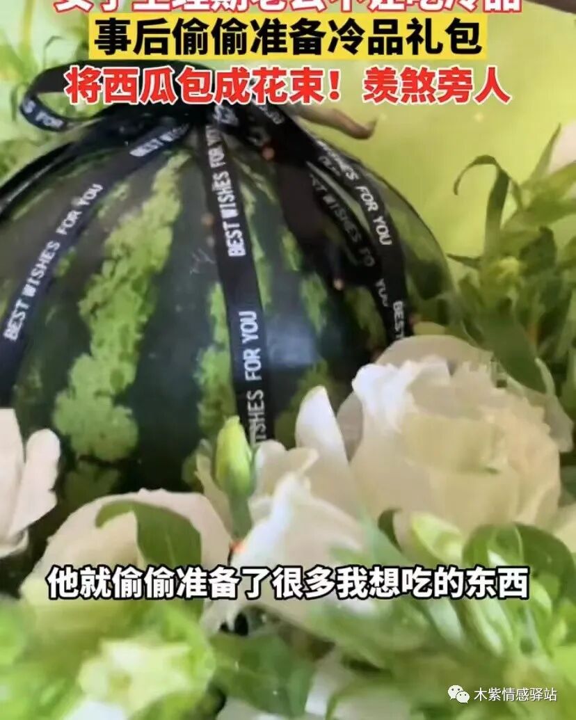 过了几天,女子生理期结束了,这天下班回来的时候,丈夫手里拎了一大堆妻子爱吃的零食,并且怀里还抱了一个精心装扮好的大西瓜,新鲜而又硕大的西瓜,被精心用绿色的花束包围在一起,看起来十分隆重的样子。
