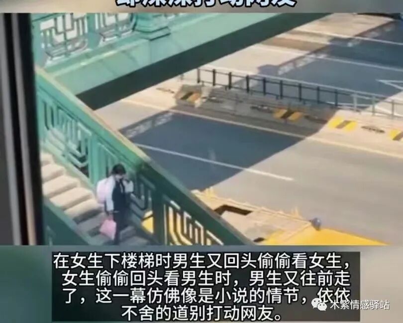 这是一幅非常美妙又温馨的画面,在如此清新绿意的桥上上演,让拍摄视频的男网友忍不住感叹:太美了,这简直就是爱情小说中的浪漫场景,短短几十秒内,两个人几步一回头,深深地打动了他内心,让他觉着,这就是爱情最初的模样吧?