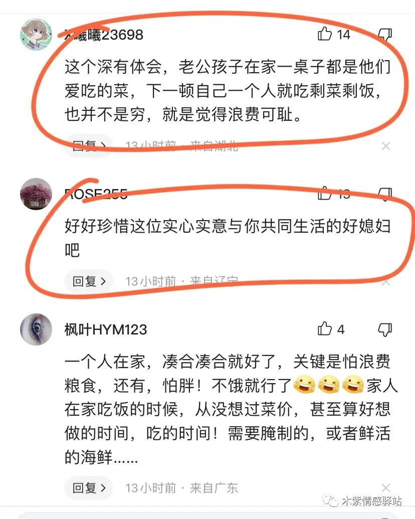 网友木易清扬说,也不是不舍得花钱,好像自己一个人就不值得专门去做啥好吃的。