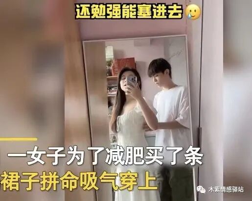 比如下面这位美女,她为了逼着自己减肥,买衣服的时候,特地购买小一码的裙子,努力穿了进去,不料想,吃过饭后,却被累的无法呼吸,让人哭笑不得。