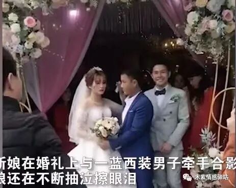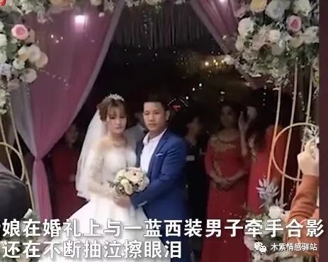 可是,新娘面色悲戚,眼角垂泪,不停地抽泣,在她的身边,一位年轻男子身着深蓝色西装,紧紧地握住新娘的手,像是在耐心地安慰她,男子相貌英俊,仪表堂堂。
