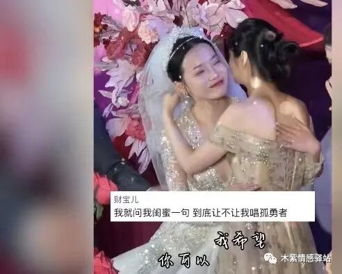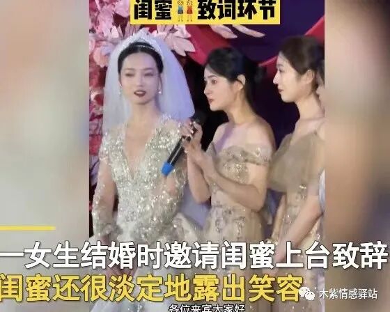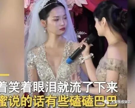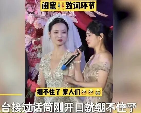 “各位来宾大家好,我是最美丽新娘的闺蜜!”女子前面的话说得很流利,可是,后面的话语,她就哽咽着变了声音,她接着落下泪来,看起来有点儿激动,新娘赶紧拍拍她,贴心安慰。