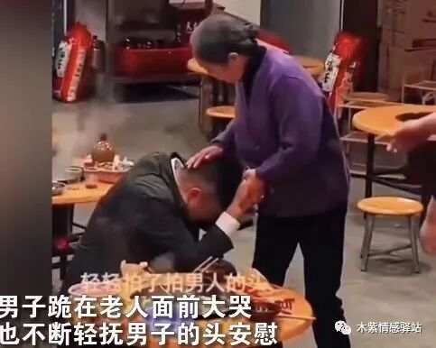 中年男子听了后,也是十分动容,而老人家听说原因后,她不仅没有生气和责怪年轻男子,反而伸出手来,慈爱地轻抚他的头部,拍拍他的肩膀,轻声安慰。