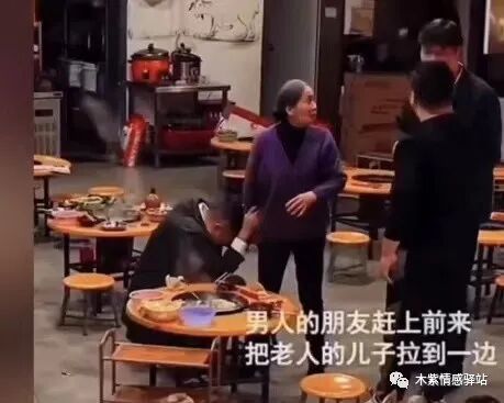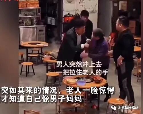 旁边的中年男子正想要发作,年轻男子的同伴赶紧上来,对中年男子解释说,他的朋友错把老人认成已经过世的母亲了,所以才会如此激动。
