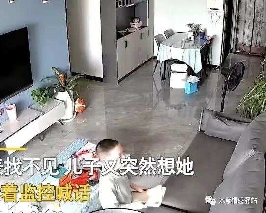 孩子走到客厅里,冲着屋里的监控摄像头,抬起头,开始叫妈妈。