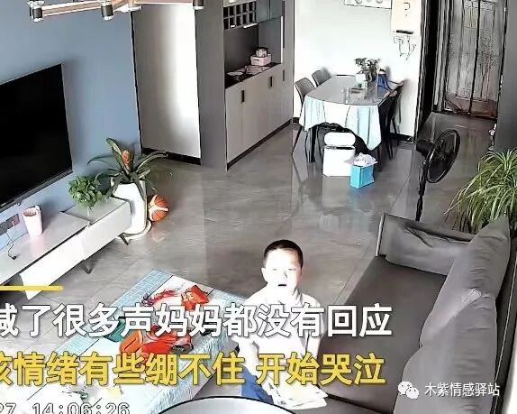 孩子的情绪逐渐有点儿失控,连声音都变了腔调,接着他开始轻轻地哭泣,孩子失望地盯着监控,多么希望妈妈能赶快出现,帮帮自己。