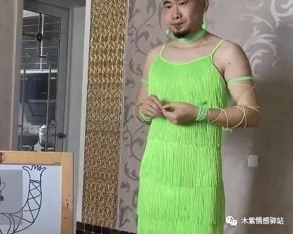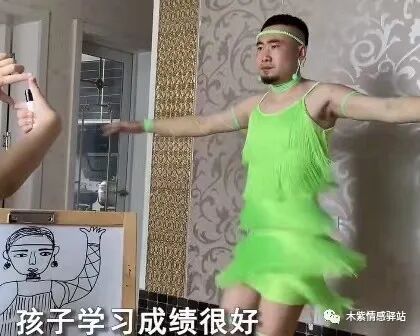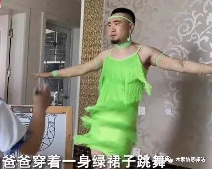 坐标山东青岛,一位网友分享了一段有趣的家庭短视频,画面中,一名中年男子打扮怪异,他穿着翠绿色的流苏吊带短裙,头上还绑着同色的发带,在客厅里静静地站着,面色凝重。