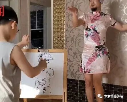 儿子画完一副之后,在他的要求下,男子又去换上一身粉色刺绣的短袖旗袍,看来为了孩子的学习,这位爸爸也是豁出去了。