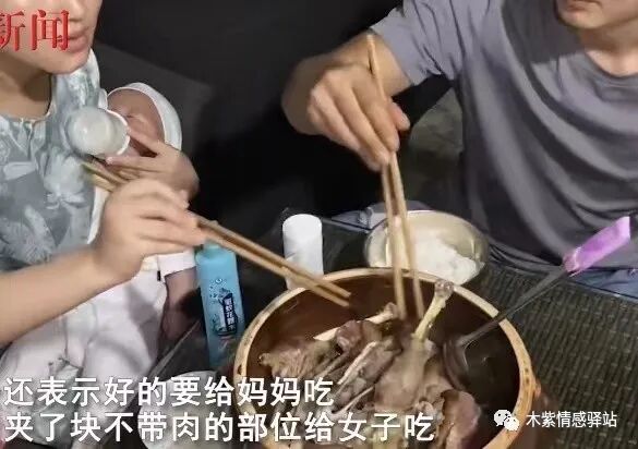 男子随后拿起筷子,把鸡腿放到对面坐着的老妈碗里,妻子一时间不知所措,手拿着筷子停顿在半空里。
