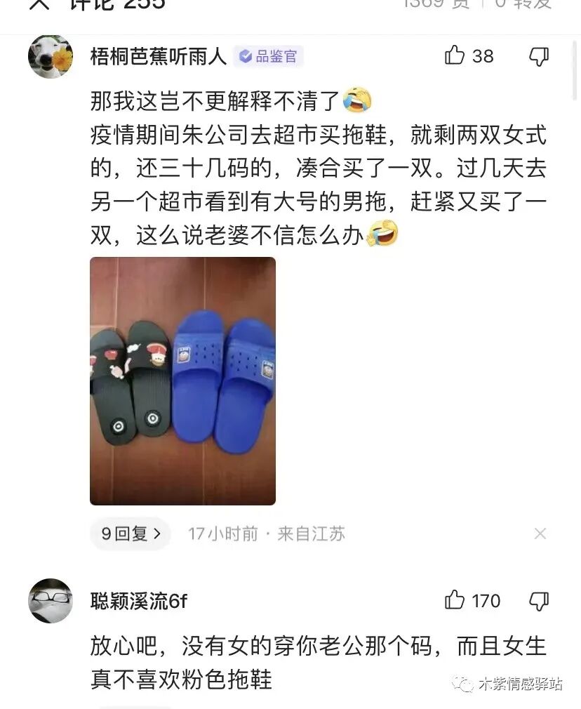 还有网友安慰她说,放心吧,没有女的会穿你老公穿的那个鞋码,起码42以上吧?再说了,女人真心不喜欢粉嫩色。