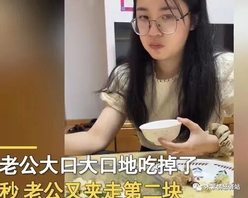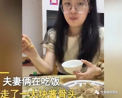 妻子表情纠结而又痛苦地望着老公,这时,男子又从盘子里面夹起来一块肉多的酱骨头,妻子多么希望他能把这块肉放进自己碗里啊,她眼巴巴地望着老公的筷子,可惜的是男子很快大口大口地吃掉了。