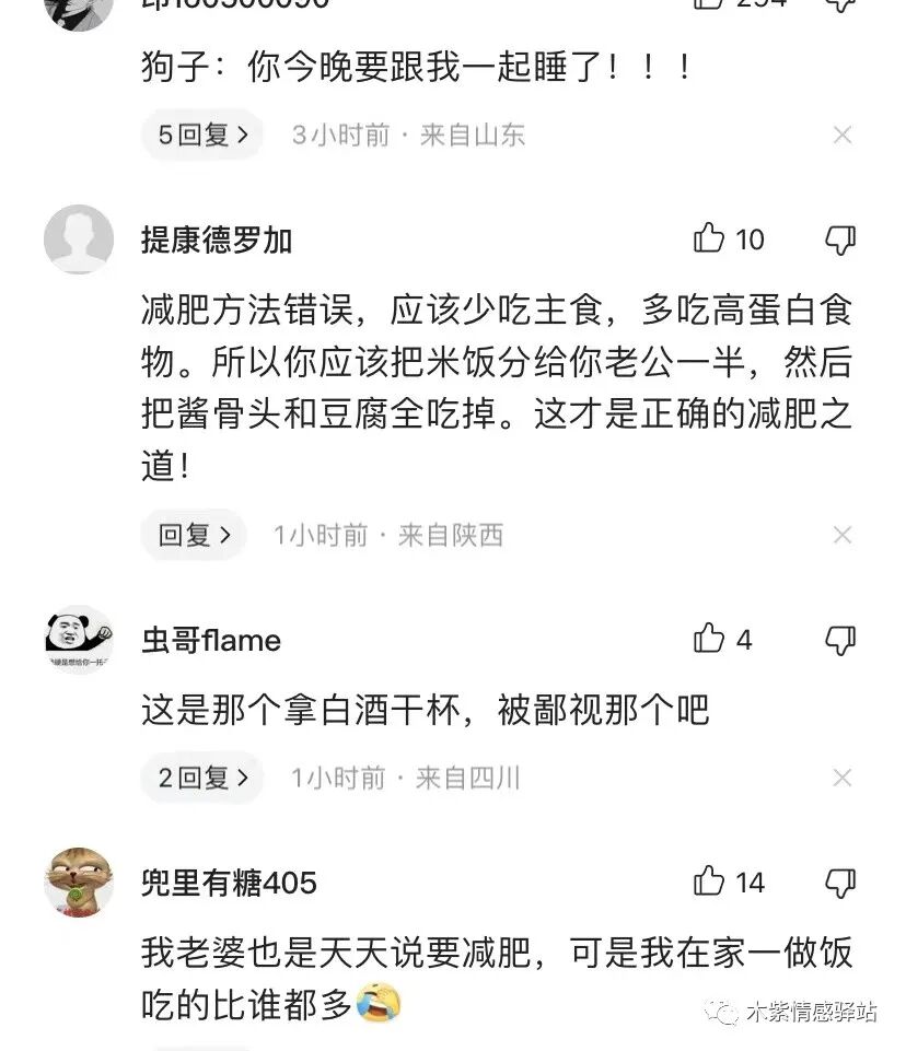 不过,也有网友对女人减肥提出了中肯的意见,她说,这位美女的减肥方法错误,应该少吃主食,多吃高蛋白实物。所以她应该把米饭分给老公一半,然后把酱骨头和豆腐全部吃掉,这才是正确的减肥之道。