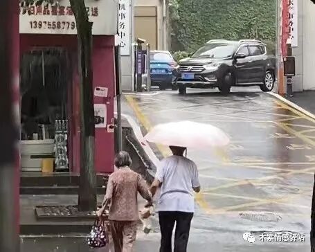 最终,老奶奶赶上了老伴,老爷爷看到她没有买到雨伞,也没有说什么,仍然打着伞,独自离去。