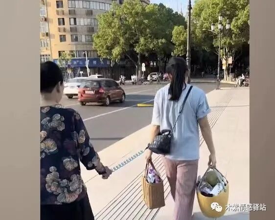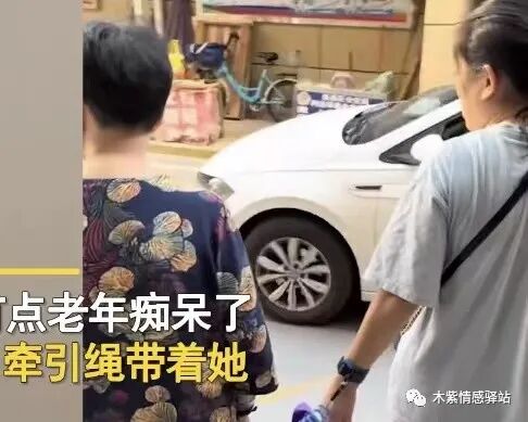 只见女子手上拴着一根蓝色的牵引绳,绳子的另一端跟着一名老年妇女。