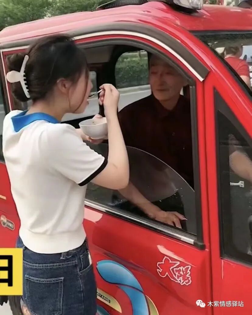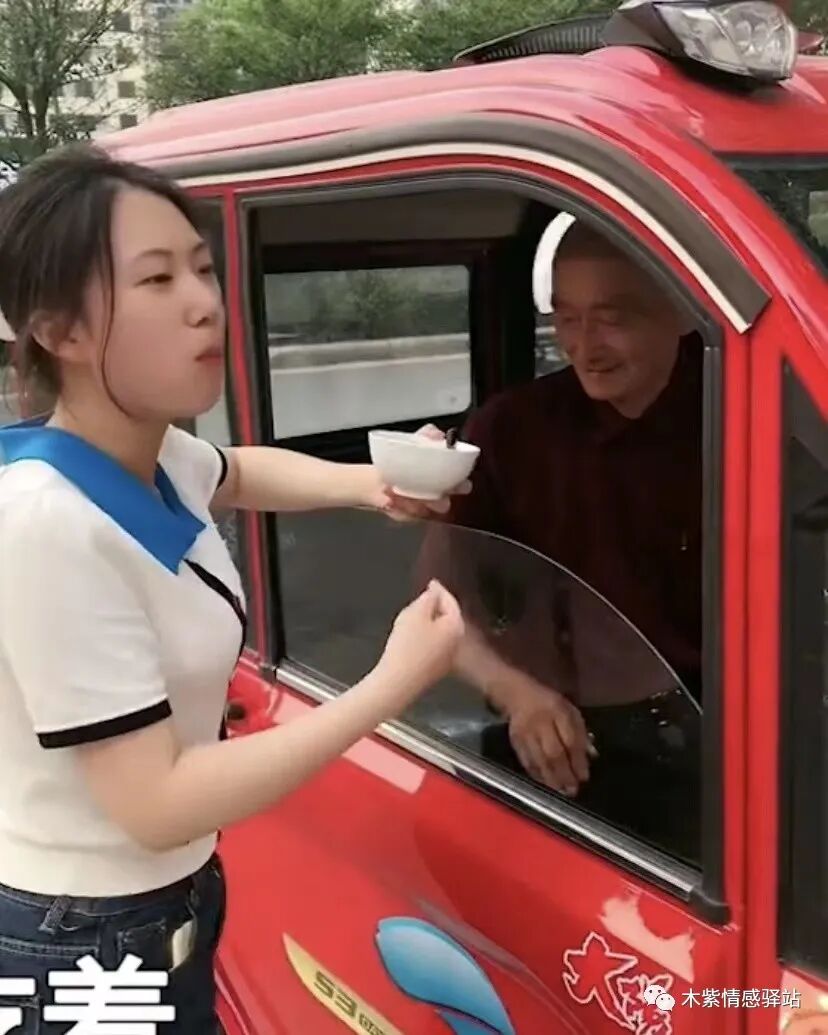 车旁站着一个身材苗条,肤色白皙,面容较好的 年轻女孩,女孩是老人的孙女,今年22岁,姑娘看起来十分乖巧,她一只手端着一个白色的小碗,另一只手正舀起碗里的绿豆粥,大口大口地吃着。