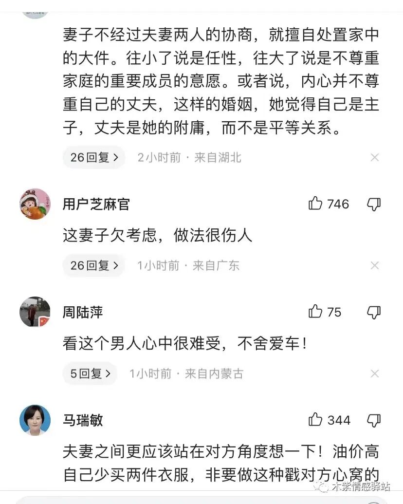 更多的网友则是猜测车应该是在妻子名下,所以妻子不经过丈夫同意直接把车子卖掉,说明妻子平时在家中也很强势,说一不二。