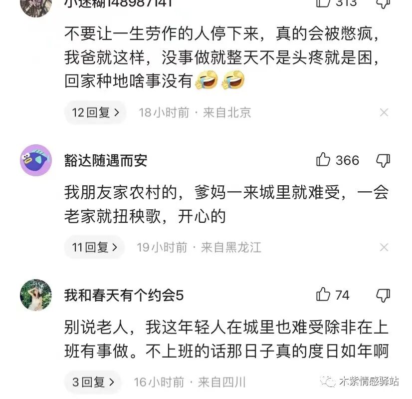 有网友说,我朋友家是农村的,爸妈到城里来也是浑身难受,一回到老家就开心地不得了,跳广场舞,扭秧歌。