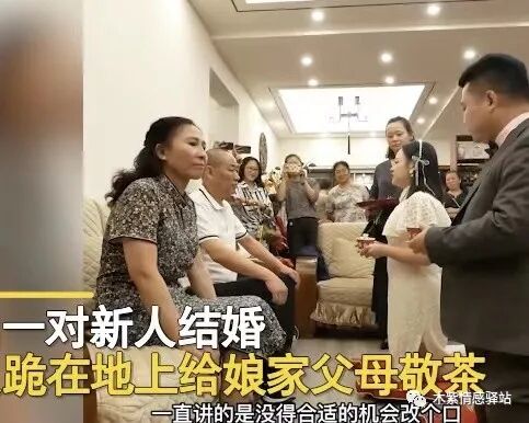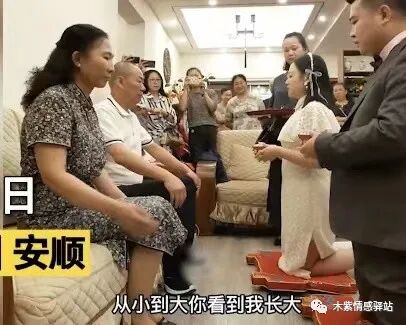 新娘子穿着白色的修身旗袍,跪在红色的垫子上,双手捧茶,动情地对面前的继父说:“我从小到大都是你看着我长大,一直都想要找个合适的机会改个口,今天趁这个机会,我改个口,以后,你就是我的亲爸爸!”