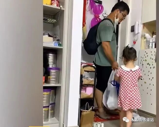 门开了,满头大汗的年轻爸爸,顾不得擦拭脸上的汗水,赶紧把手里提着的物品交给女儿,那都是孩子喜欢吃的东西。