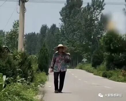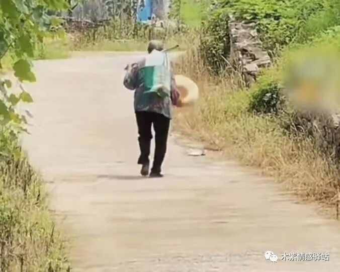 画面中,一位老奶奶,穿着碎花青布衫,黑色长裤,正是酷暑三伏天,乡下路上人烟稀少,只有她,扛着一根粗粗的木棍,木棍一头挑着一个绿色的礼品盒,里面是新鲜的水果。