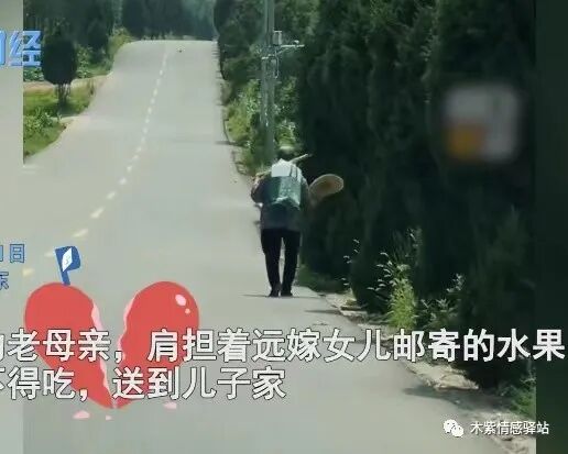 有好心人问老奶奶,这么大热的天,这是去干什么?老奶奶说,远嫁的女儿,给自己邮寄了两箱当地的新鲜水果,自己舍不得吃,去送给儿子家。