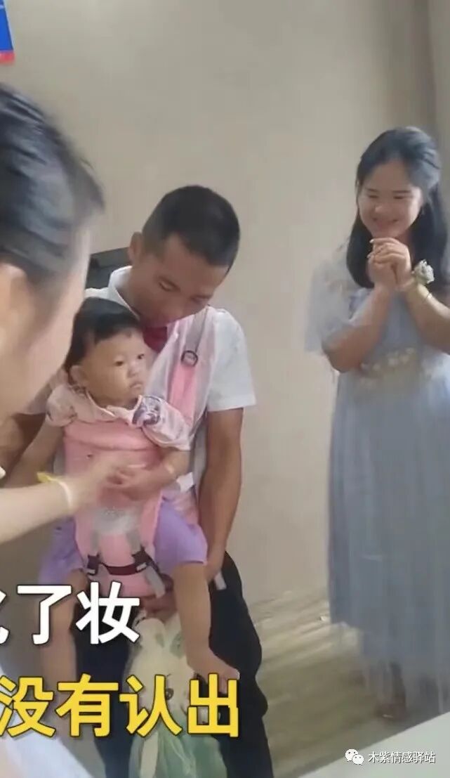 而宝宝面对新娘也是一脸茫然,仿佛不认识一般,新娘接下来伸出手,慈爱地抚摸了一下孩子的小腿,而周围的伴娘则起哄说:快叫妈妈,叫妈妈!