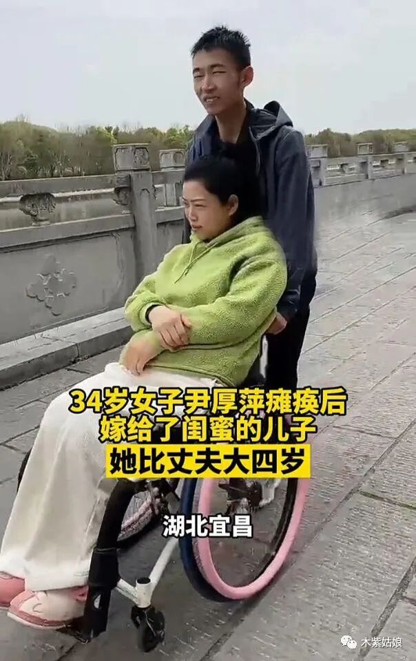 这个坐在轮椅上的女子叫尹春萍,现在是34岁,站住旁边的是她现任丈夫,尹厚萍比他大4岁,后面的是她的婆婆,也是她的好朋友闺蜜。也许有人问,这个闺蜜年龄相差太大了吧,相差了17岁,这两个人怎么会成为闺蜜呢,这个要从尹厚萍的坎坷人生说起。