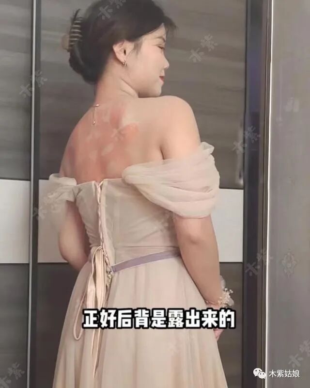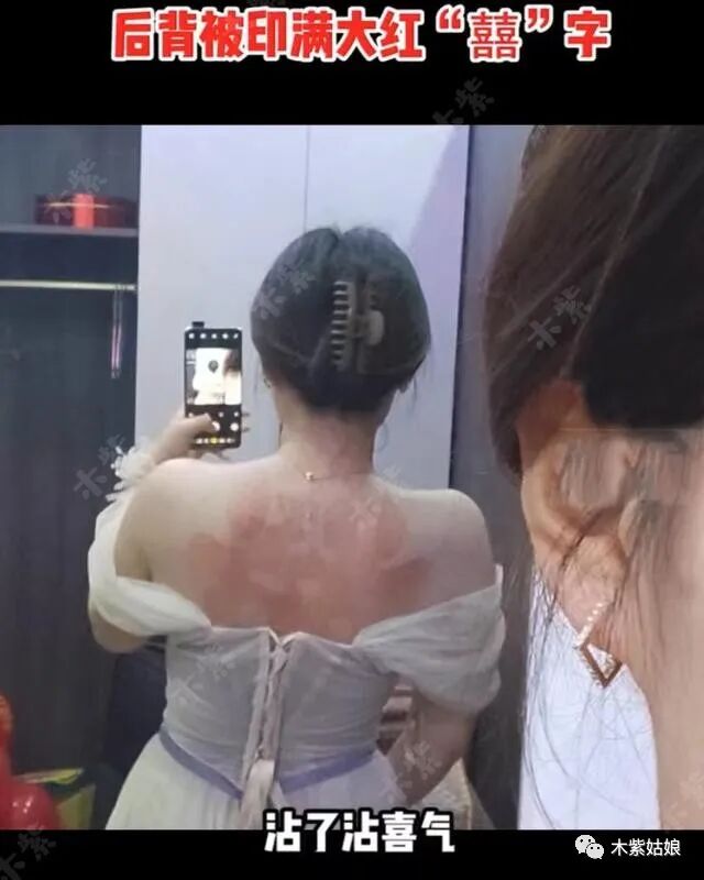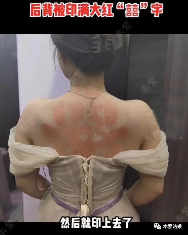原来,婚礼当天,她穿了露背装的裙子,在她躺在印有“囍”字的躺椅上休息的时候,正好被完整地印了一个大红“囍”字。