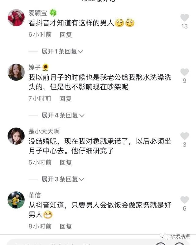 网友们纷纷发表自己的看法,有网友说,好男人都在网络里,在某音里面,俺家那位,坐月子给做饭都快要烦死了。