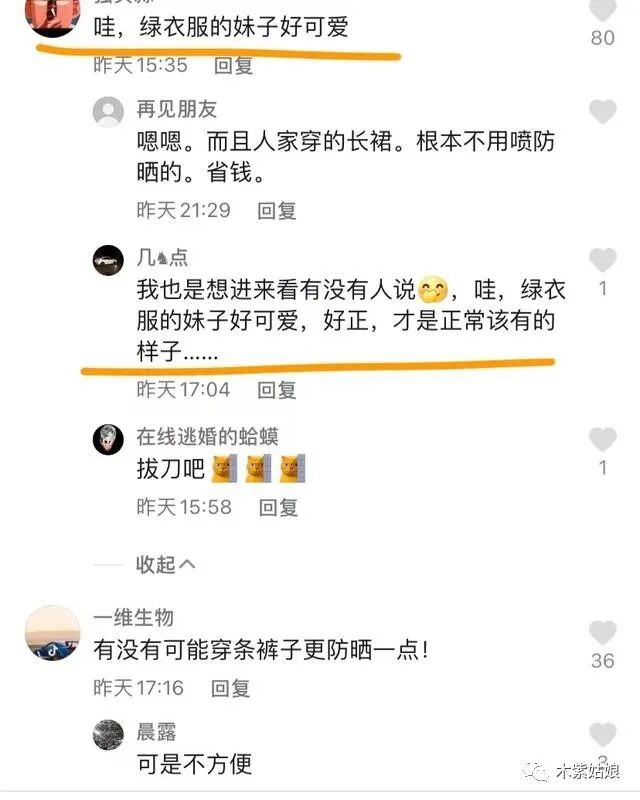 网友独头蒜说,看看人家绿衣服的小姐姐,穿着长裙,也不用喷防晒霜,又可爱又正点,这才是女孩子该有的模样。